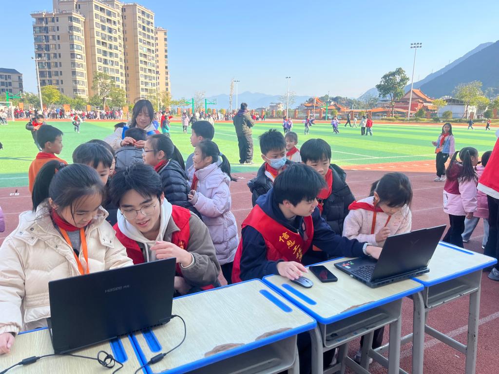 活动期间,志愿服务队在校园操场精心设置了多个科技互动展台,集中展示了智能机器人、无人机、3D打印机等人工智能相关设备,并安排了“水火箭”“彩虹雨”等融合基础物理、化学原理的简易科学实验。活动还专门设计了适合小学生的编程启蒙游戏,引导孩子们通过鼠标操作控制屏幕角色完成任务,在互动中体验编程乐趣。现场气氛热烈,小学生们在观看演示、动手实践、参与挑战的过程中,切身感受到人工智能的趣味与魅力,也在心中悄然播下了热爱科学、敢于创新的种子。