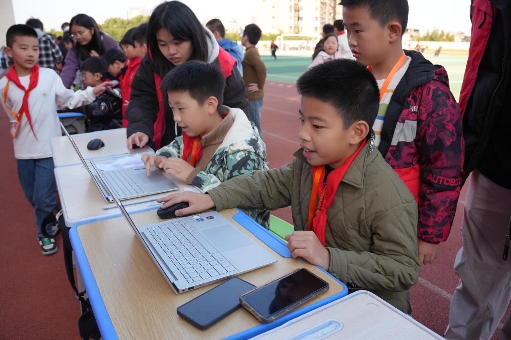 在化学魔法区,同学们亲手操作经典实验,观察奇妙的反应现象;AI体验区内,大家借助虚拟现实技术沉浸式“触摸”未来;编程闯关区吸引众多小“程序员”驻足尝试,感受代码背后的逻辑趣味。操场上,水火箭一飞冲天,无人机翩翩起舞,机甲车灵活穿梭,引来阵阵欢呼;科技馆展区内,机器人与机器狗的生动互动,充分激发了学生们的好奇心与探索欲。
