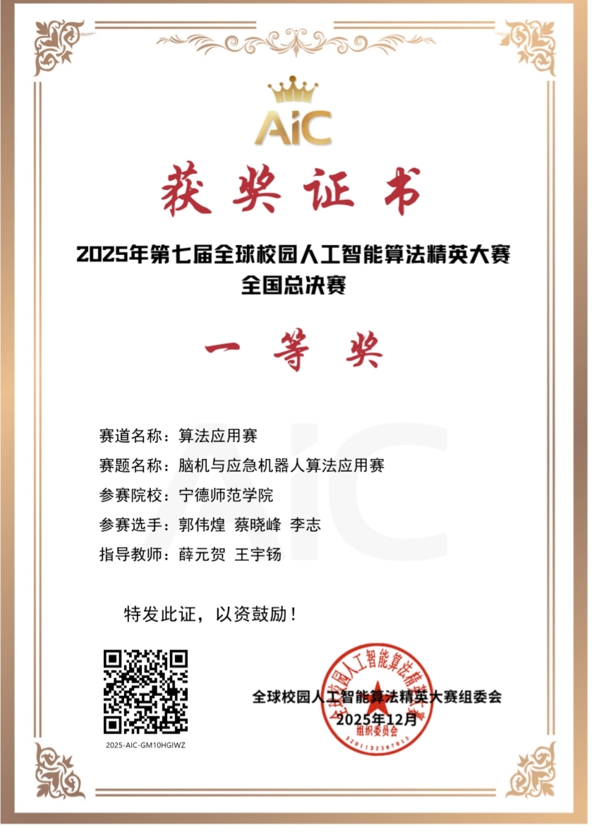 近日,第七届全球校园人工智能算法精英大赛顺利收官。宁德师范学院信息工程学院代表队(电子信息专业学生:郭伟煌、蔡晓峰、李志)在薛元贺、王宇钖老师指导下,聚焦“脑机与应急机器人算法应用赛”方向,开展了一系列创新算法研究和实践应用开发工作。该团队凭借坚实的理论基础、创新性的技术方案与卓越的实践能力,得到评审专家的一致肯定,最终荣获该赛项国家级一等奖,充分彰显了学院在人工智能前沿交叉领域的育人成果与科研创新实力。