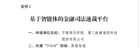 近日,福建省发展和改革委员会发布《福建省未来产业典型应用场景成果汇编(第二批)》,宁德师范学院与厦门纵横集团科技股份有限公司联合研发的 “基于智能体的金融司法速裁平台” 成功入选数据智能领域典型成果,成为数据智能领域的重要示范成果。
